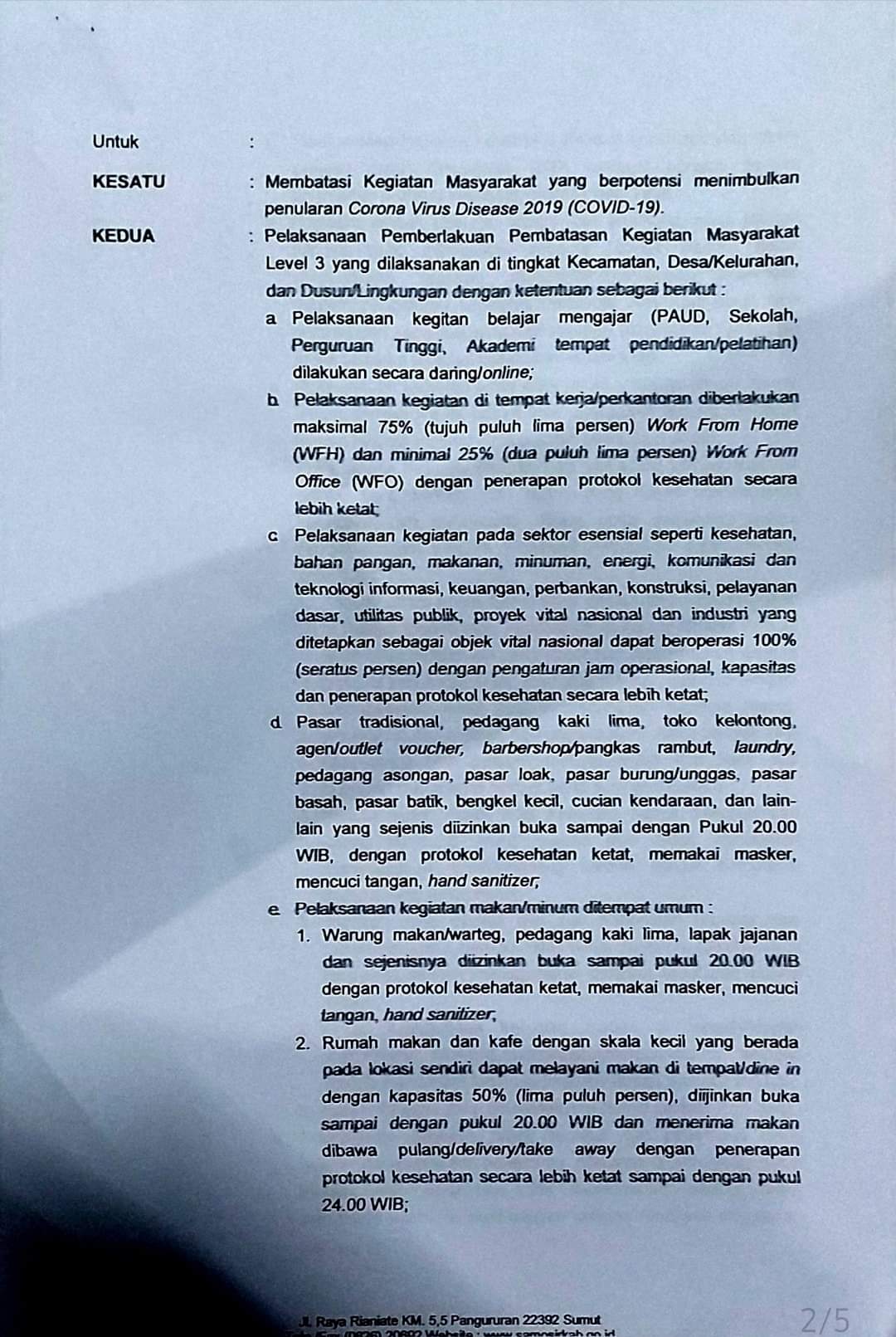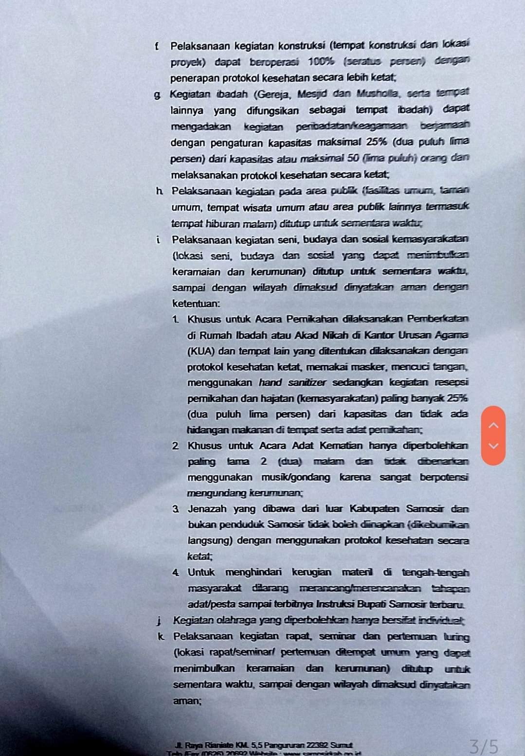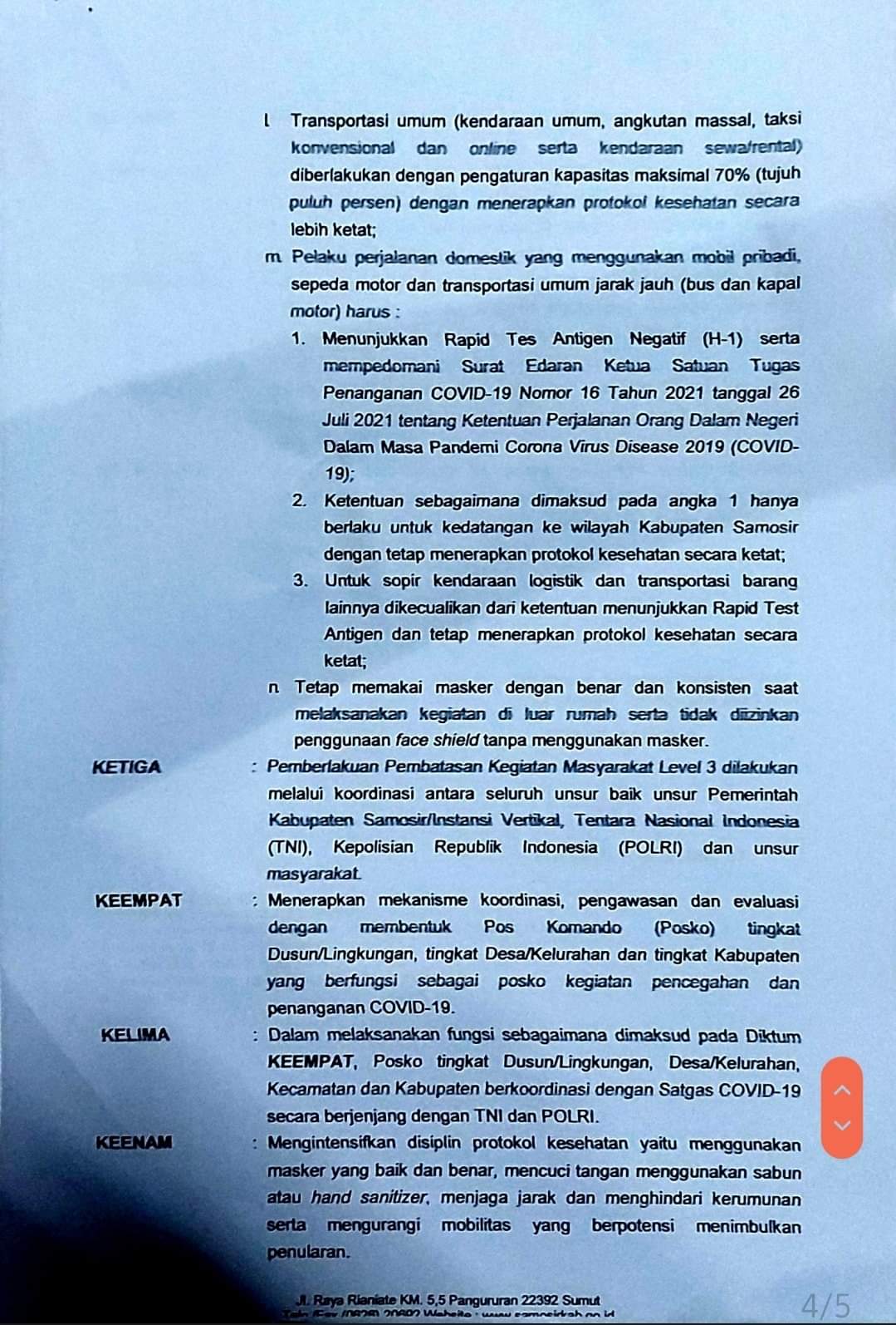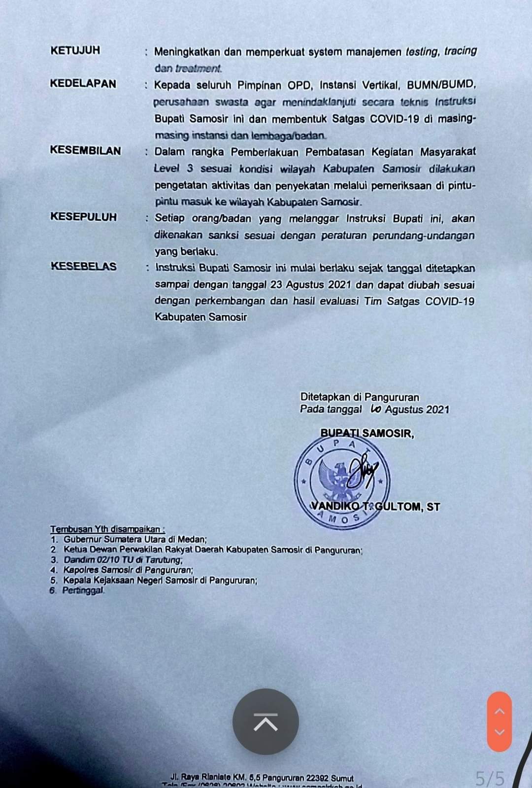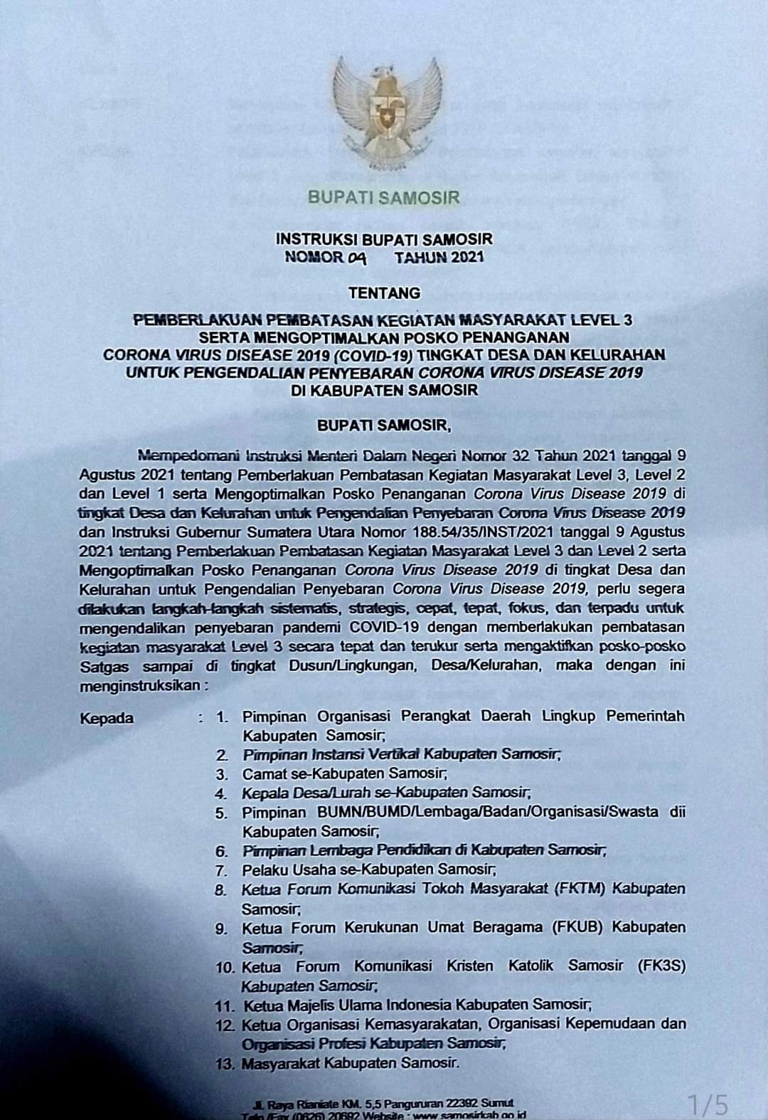Samosir , Instruksi Bupati Samosir Nomor 04 Tahun 2021 Tentang Pemberlakuan Pembatasan Kegiatan Masyarakat Level 3, serta mengoptimalkan Posko Penanganan Covid 19, tingkat Desa dan Kelurahan untuk Pengendalian Penyebaran Covid 19, di Kabupaten Samosir.