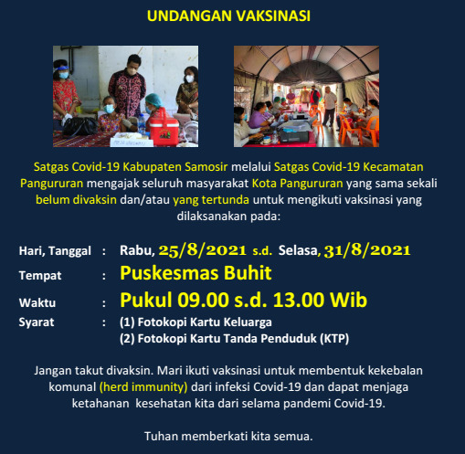 Samosir Undangan Vaksin di Kabupaten Samosir , 25 Agustus 2021 sampai 31 Agustus 2021 Agustus 24, 2021oleh SINARNEWS Media Online-16 Dilihatoleh SINARNEWS Media Online