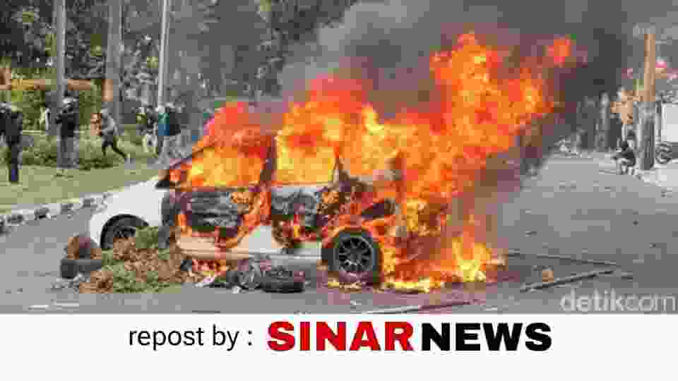 Jakarta – Satu unit mobil terbakar di tengah kerumunan massa aksi depan Markas Satuan Brimob Polda Metro Jaya, Kwitang, Jakarta Pusat. Mobil tersebut pun langsung hangus.